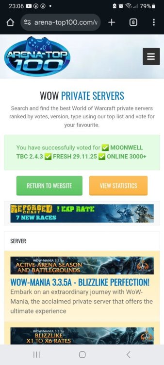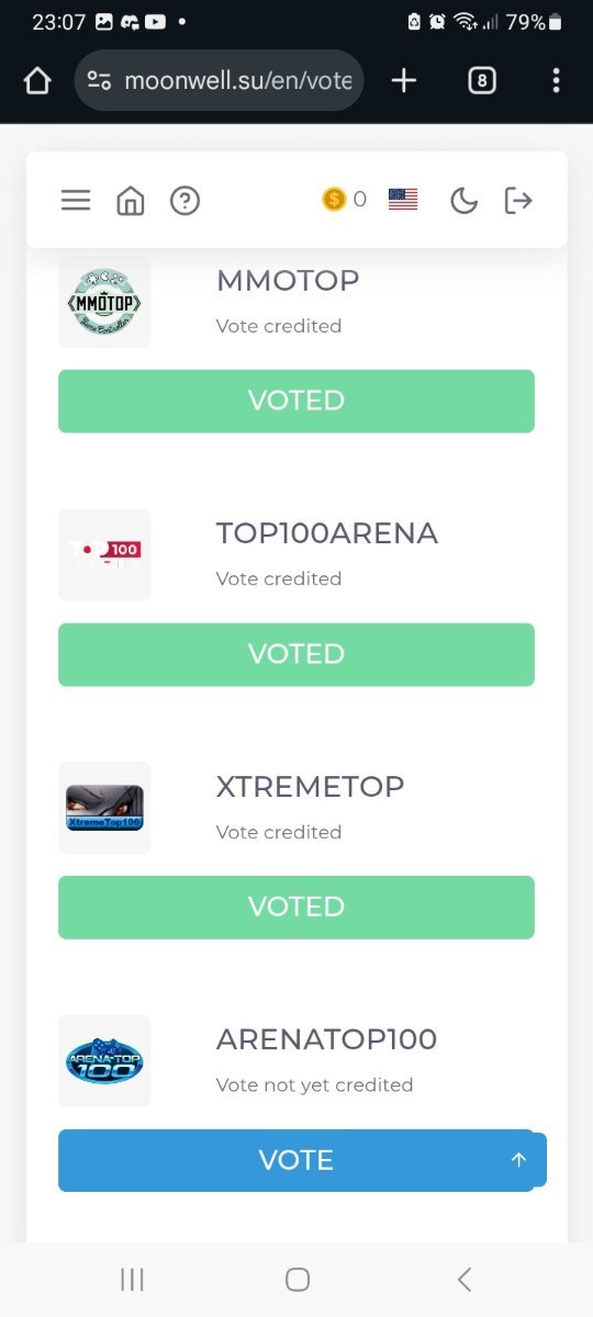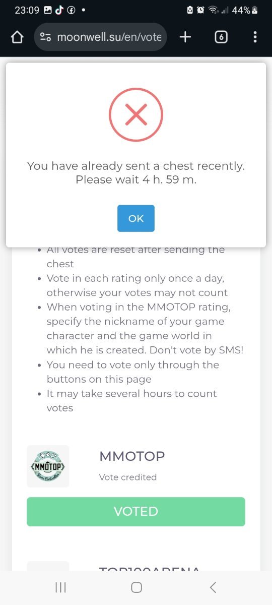 ARENATOP100 doesnt want to count the vote 2hours and 30 mins untill now,I can't get my reward becouse of it.... please help as fast as posible...I tried to vote again and again maybe 50 times doesnt help... eveytime i check moonwell.su/vote_server it doesnt couny the vote...