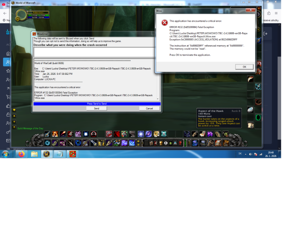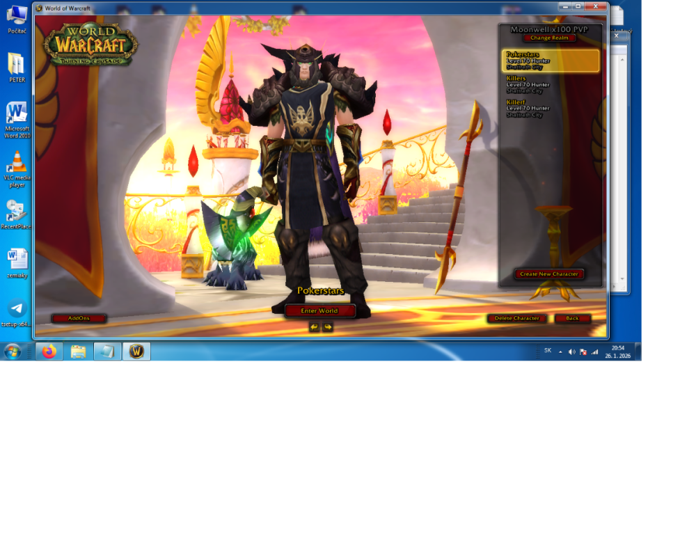 My friend already contacted you, but he does not speak English or Russian very well, so I am writing on his behalf. He has a problem logging into his account. The basic login works fine and he has 3 hunter characters on the account. However, when he tries to enter the game with the hunter named Pokerstar, he always gets a WoW error and the game crashes. This does not happen on the other two hunters. We are not sure where the problem could be. He has never had any bans and does not know what to do. He was told that the issue might be caused by his pet, but he has not changed the pet’s name since the beginning of the game. Could you please help him or check what might be causing this problem? Best regards, P I am attaching screenshots: – the first one shows the basic login screen – the second one shows the WoW error that appears when trying to log in with the character Pokerstar