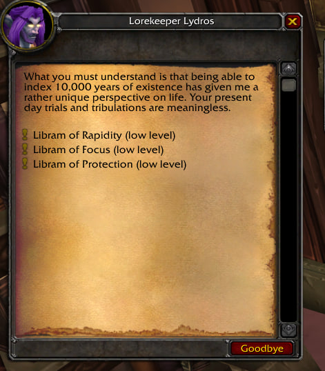 Hello @Dreamwell, In order to receive the "Libram of Rapidity" quest, you must first complete the "Elven Legends" quest. https://db.moonwell.su/?quest=7481 (Horde) https://db.moonwell.su/?quest=7482 (Alliance)