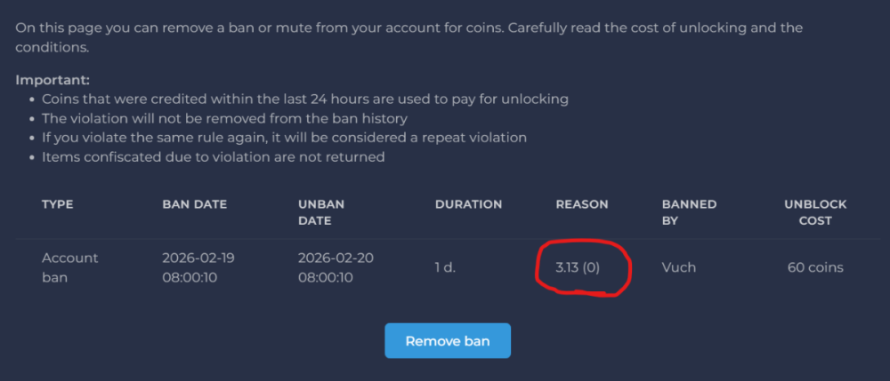 Wll , I ve seen the reason of banned which makes sense & fair enough and it was just misclick + i am okey with that. But i thought i got banned for another reason. Althought, the bann/punishment on my account was 3.13, hence the punishemnt as gm mentioned was 3.11 (which makes sense now ) x1 of my freinds sends me the link of ticket , after, so that i have no objection & case closed Plz close the topic thanks.(Here is the misunderstanding reason:)