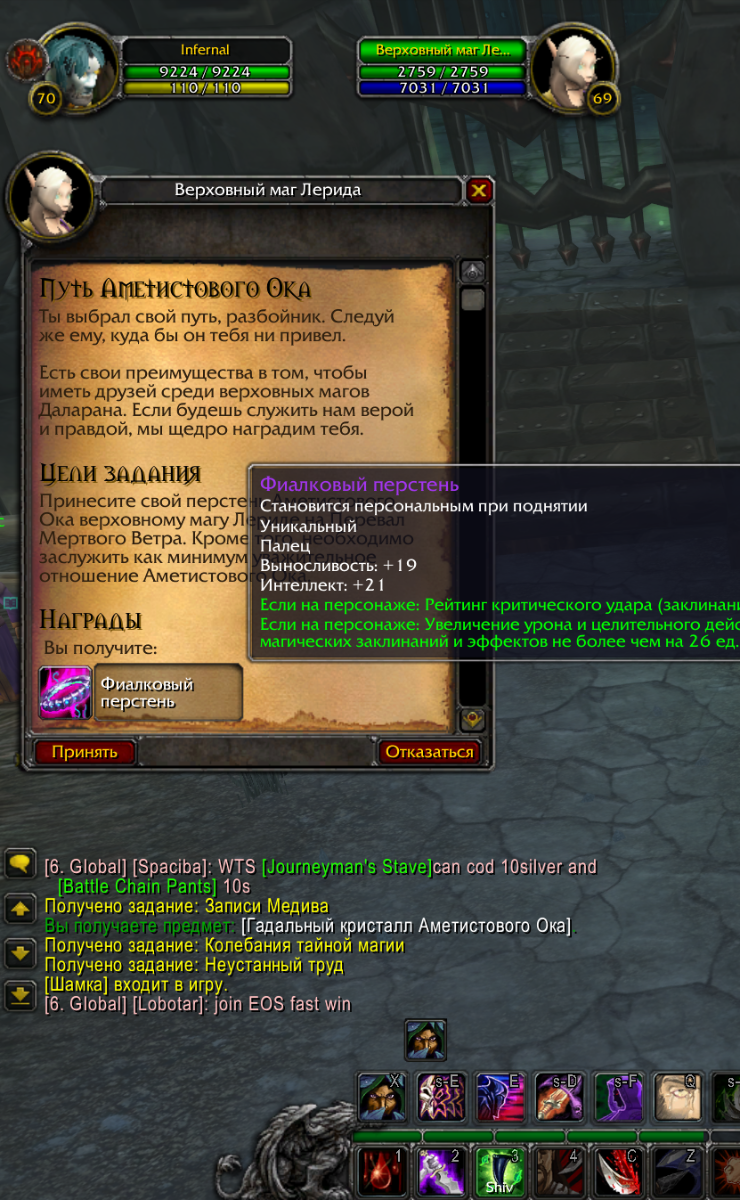 Добрый вечер, по ошибке сдал не тот кв с названием Путь Аметистового Ока, на кольцо Фиалковый перстень у нпс у входа в Каражан, оно для меня бесполезное, можно как то скинуть кв, и я получу кольцо на свой спек? Ник Infernal Realm Moonwell x5