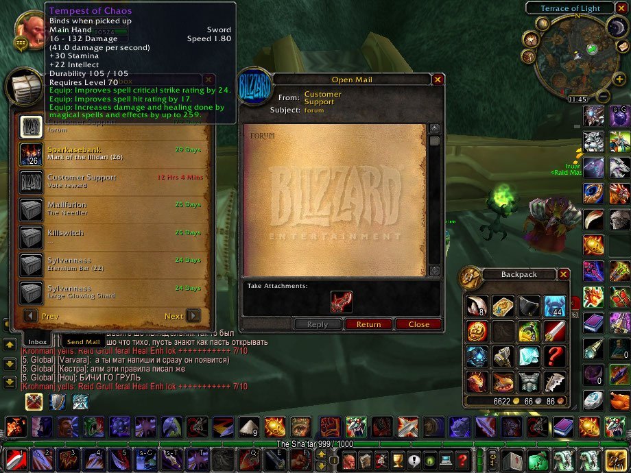Items ( neck Amulet of the flowing life) need to go to shaman name Thrrall and Sword (Tempest of Chaos) should go to Paladin name Wrynn (You made a mistake distributing only the sword to my main character who is Warrior instead to paladin,i didnt took it from the mail I wait You to redistribute it (to delete it from warrior and send it to paladin (Wrynn)