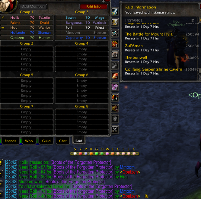 Здравствуйте, 2026-04-07 22:23:54 # [Exlarmonda]->ROLL_GROUP_WON: Player Exlarmonda(guid 31147) received Item 32590 (need) (class: Mage, spec: 40/0/21) 2026-04-07 22:23:54 # [Exlarmonda]->ROLL_GROUP: item 32590 - 39 (class: Mage, spec: 40/0/21) 2026-04-07 22:23:54 # [Solomon]->ROLL_GROUP: item 32590 - 36 (class: Warlock, spec: 0/21/40) https://db.moonwell.su/?item=32590 перераспределен к [Solomon]. Приятной игры!