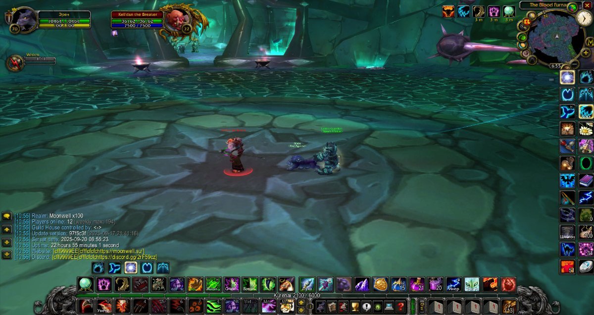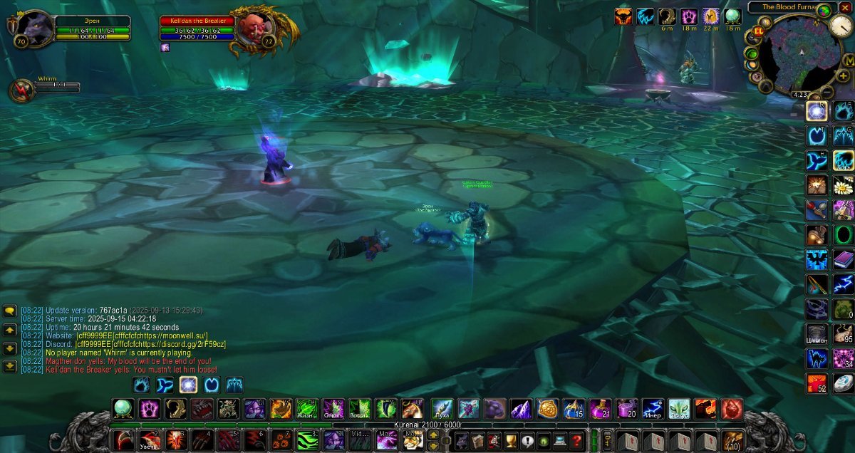 1.) Периодически после убийства пяти мобов Чаротворец клана Призрачной Луны босс Кели'дан Разрушитель остаётся недоступным для атаки. Иногда всё в порядке и после убийства чаротворцев он сразу вступает в бой и его можно атаковать, а иногда происходит подобный баг. После перезахода в игру через час и более, чаротворцы воскресают и после их убийства иногда босс становиться активным, а иногда нет. Бывало так, что за один КД 3 раза убивал чаротворцев, а босса убить так и не удавалось, из-за этого 3-4 раза впустую тратил время :( Данный баг был выявлен в героическом режиме, как обстоят дела на обычном режиме - не проверял. На скриншотах виден зависший бос 2.) Последовательность действий: агрю первого выделенного в цель чаротворца и убиваю с использованием голема-помощника в случайном порядке. 3.) Как должно работать: чаротворцы стоят вокруг босса, направляя друг в друга лучи, образуя пентаграмму, в этот момент босса можно выделить в цель, но атаковать нельзя. При вступлении в бой с любым из чаротворцев, пентаграмма из лучей пропадает, и они начинают кастовать в игроков стрелу тьмы, в этот момент босс также остаётся неподвижным, недоступным для атаки и сам не атакует игроков. После убийства всех пяти чаротворцев, босс вступает в бой и ему можно смело ломать лицо. Как то так это должно выглядеть, видео с ютуба , самое нормальное видео убийства босса, что нашёл, вроде с оффа. Хоть в видео уже дополнение Катаклизм, но данжи БК контента тогда совсем не менялись в плане механик. 4. Сервер х100 5. Версия 97f5c3f 6. Персонаж Эрен. P.S. буду признателен, если на персонажа Эрен будут высланы штаны Leggings of the Unrepentant , которые падают с данного босса. Вещь не даст никаких преимуществ в игровом процессе, нужна исключительно для трансмога, только ради неё занимаюсь данным мазохизмом. Как написал выше, уже раза четыре не смог убить босса из-за данного бага, и стопудов в одно из этих убийств выпали бы данные штаны :( К тому же, больше нет никакого желания проходить данное подземелье, пока баг не будет исправлен.2 лайка