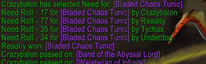 Добрый день, Рейд в Блек Темпл, ID: 208151 Рейд лидер "Reaally" вначале рейда попросил всех написать на какой спек они ролят "1 spec or 2 items". Reaally - Энх, Aryamo - Шп, Подшофе - Элем, Whatusaymyma - Ретрик. Других оповещений от участников рейда или лидера не было. На втором боссе выпадает предмет: Bladed Chaos Tunic Выиграл предмет по справедливости Reaally, но в роле участвовали Прот Вар "Tychax" (который не оповещал никого на какой спек он ролит а присоединился в роле танка) и балон друид "Crazybalon" который после дропа предмета написал что он ролит на кота а на последнем боссе совсем передумал и написал что теперь ролит на балона. Прошу проверить и выдать бан согласно правила 3.11 Умышленное мошенничество при распределении добычи в рейде. Блокировка аккаунта на срок до 7 суток. Игрокам под никами "Tychax" и "Crazybalon". Спасибо!2 лайка
