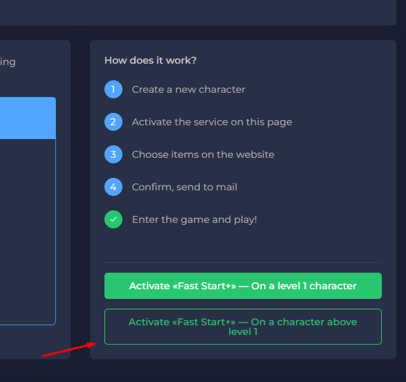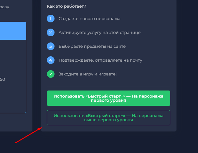 По многочисленным просьбам мы добавили возможность активации «Быстрого старта» для существующих персонажей. Уровень персонажа будет повышен до 70-го, вы получите все предметы, ридинг и остальные стандартные бонусы «Быстрого старта», однако при таком способе активации вы не сможете выбрать или изменить профессии. Активировать услугу на существующего персонажа выше 1 уровня можно нажав дополнительную кнопку.