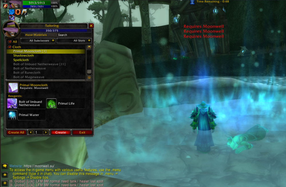 In short - I can't create a Primal Mooncloth. I get a message that a Moonwell is required when I'm literally standing right in the middle of it. I think the problem is specific to my character (I asked others in the game and it works for them).