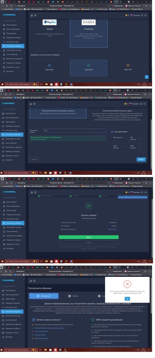 3. ΠŸΡ€ΠΈ ΠΏΠΎΠΏΡ‹Ρ‚ΠΊΠ΅ ΠΏΠΎΠΏΠΎΠ»Π½ΠΈΡ‚ΡŒ баланс Π»ΠΈΡ‡Π½ΠΎΠΌ ΠΊΠ°Π±ΠΈΠ½Π΅Ρ‚Π΅ Π²Ρ‹Π΄Π°Π΅Ρ‚ ΠΎΡˆΠΈΠ±ΠΊΡƒ. Π‘ΠΎΠΎΠ±Ρ‰Π΅Π½ΠΈΠ΅ Π·Π²ΡƒΡ‡ΠΈΡ‚ Ρ‚Π°ΠΊ "Π’ΠΎΠ·Π½ΠΈΠΊΠ»Π° ошибка. ΠŸΠΎΠΏΡ€ΠΎΠ±ΡƒΠΉΡ‚Π΅ снова ΠΈΠ»ΠΈ ΠΎΠ±Ρ€Π°Ρ‚ΠΈΡ‚Π΅ΡΡŒ ΠΊ администрации #15" Π‘ΠΊΡ€ΠΈΠ½ΡˆΠΎΡ‚Ρ‹ ошибок Π²ΠΎ Π²Π»ΠΎΠΆΠ΅Π½ΠΈΠΈ Π˜Π³Ρ€ΠΎΠ²ΠΎΠΉ Π½ΠΈΠΊ Fairlady. Π‘Π°Π³ каТСтся критичСским. Π‘ΡƒΠ΄Ρƒ Ρ€Π°Π΄ Π²ΠΎΠ·Π½Π°Π³Ρ€Π°ΠΆΠ΄Π΅Π½ΠΈΡŽ ΠΈ возмоТности ΠΏΠΎΠΏΠΎΠ»Π½ΡΡ‚ΡŒ баланс.